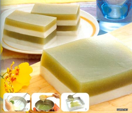 2,將材料(3)中的抹茶粉用少許冷水調(diào)拌開來,再與其余材料(3)混合,置于爐子上邊煮邊攪拌,帶沸騰時(shí),快速攪拌至弄抽狀且呈透明色,即可以關(guān)火3,待圖一凝結(jié)了,就倒入圖二,待凝結(jié),即可以食用,食用時(shí)切塊!