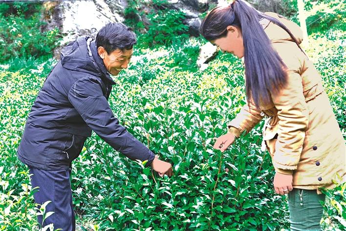 圖為勒門巴民族鄉(xiāng)茶葉農(nóng)牧民專業(yè)合作社理事長羅布次仁(左)和技術(shù)指導(dǎo)達(dá)娃卓瑪在查看茶葉長勢