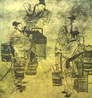 元代書畫家趙孟俯的《斗茶圖》,是一幅充滿生活氣息的風(fēng)俗畫。畫面有四個(gè)人物,身邊放著幾副盛有茶具的茶擔(dān)。左前一人,足穿草鞋,一手持茶杯,一手提茶桶,坦胸露臂,似在夸耀自己的茶質(zhì)香美。身后一人雙袖卷起,一手持杯,一手提壺,正將茶水注入杯中。右旁站立兩人,雙目凝視,似在傾聽對(duì)方介紹茶的特色,準(zhǔn)備回?fù)?。圖中,人物生動(dòng),布局嚴(yán)謹(jǐn)。人物模樣,不似文人墨客,而像走街串巷的貨郎,這說(shuō)明當(dāng)時(shí)斗茶已深人民間。