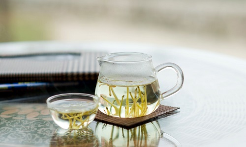 金銀花茶屬于花茶類,是用優(yōu)質(zhì)綠茶為素坯、加以新鮮金銀花,按金銀花茶窨制工藝窨制而成。夏季為金銀花的采摘期,花初開時為純白色,翌日變?yōu)辄S色,香氣逐漸散失,因此以開花當(dāng)天采摘最好。