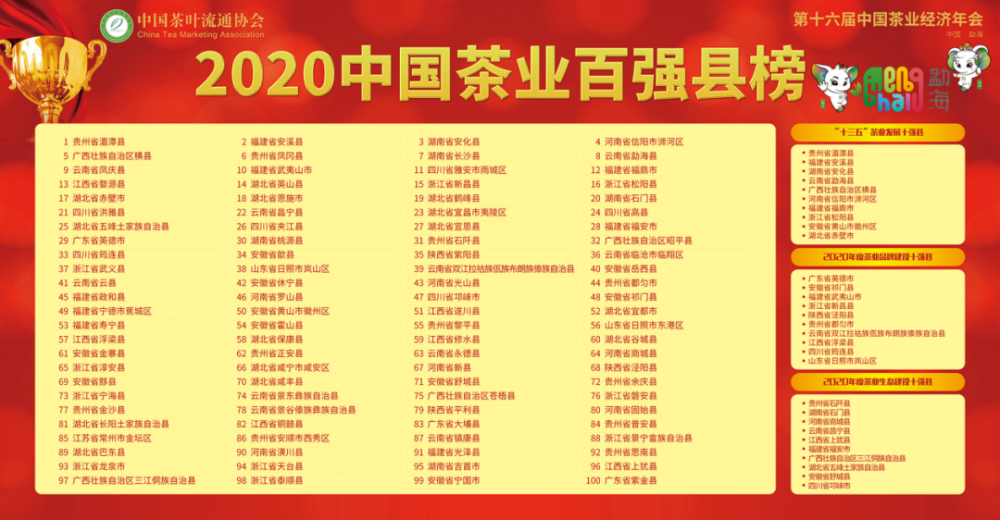11月18日,由中國茶葉流通協(xié)會、西雙版納傣族自治州政府、云南省農(nóng)業(yè)農(nóng)村廳、云南省供銷合作社主辦的“第十六屆中國茶業(yè)經(jīng)濟年會開幕式暨2020年中國茶業(yè)品牌盛典”舉行。年會公布了2020中國茶業(yè)百強縣名單,紫金縣成功入圍百強縣,是我市唯一上榜的縣區(qū)。