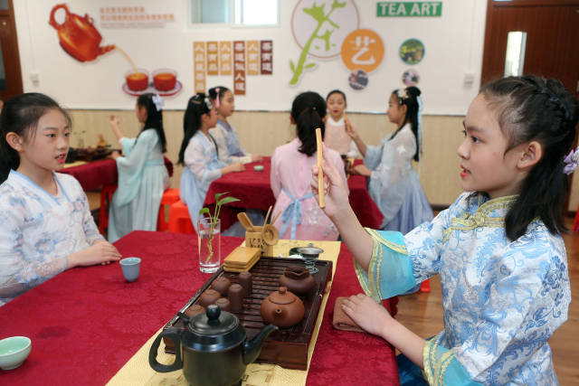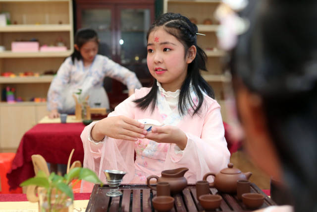日前,天津市和平區(qū)哈密道小學(xué)舉行“以華服之美,致敬茶事之道”校園茶藝展示活動(dòng),組織學(xué)生們進(jìn)行茶服和茶藝展示,在校園里弘揚(yáng)傳統(tǒng)文化。