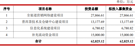 瀾滄古茶原擬在深交所主板公開發(fā)行不超過2000萬股人民幣普通股(A股),占公司本次公開發(fā)行后總股本的比例不低于25%。瀾滄古茶原擬募集資金6.28億元,分別用于“全渠道營銷網(wǎng)絡建設項目”、“普洱茶技術及倉儲中心建設項目”、“信息化系統(tǒng)建設項目”、“補充流動資金項目”。