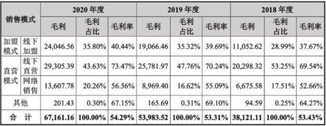 從銷售模式來(lái)看,八馬茶業(yè)采取的是“直營(yíng)+加盟”、“線上+線下”的全渠道銷售體系。截至2020年末,公司門店數(shù)量超過(guò)2000家,其中直營(yíng)店366家,加盟店超1700家。雖然,加盟店數(shù)量遠(yuǎn)超直營(yíng)店數(shù)量,但由于線下加盟模式的毛利率只有40%,遠(yuǎn)低于線下直營(yíng)模式73%的毛利率。因此,366家直營(yíng)店貢獻(xiàn)的毛利與超過(guò)1700家加盟店貢獻(xiàn)的利潤(rùn)大體相當(dāng)。