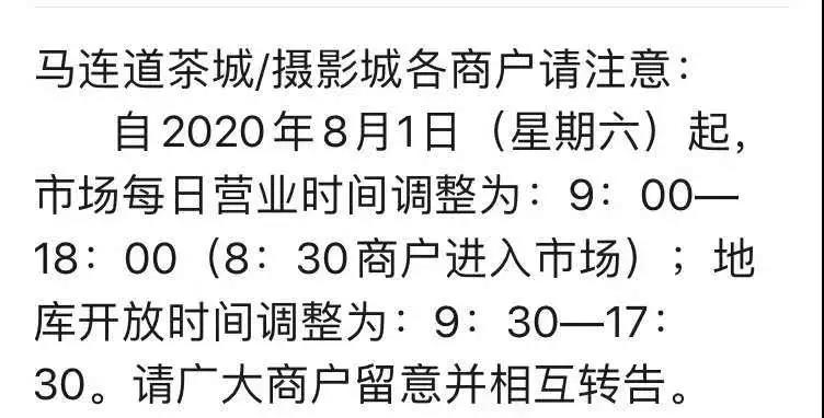 7月22日起,馬連道二商集團旗下的國際茶城、京華緣茶城、天福緣市場已恢復正常營業(yè),每天營業(yè)時間為9:00-19:00,進入茶城須出示健康寶,不必進行體溫檢測。