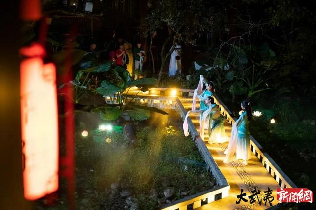 中秋之夜,月滿(mǎn)情濃。武夷山宋街景區(qū)內(nèi),流光溢彩,人流如織。吃茶、聽(tīng)曲、猜燈謎......伴隨著古街內(nèi)的典雅的古琴聲“宋風(fēng)當(dāng)潮 · 武夷月夕”活動(dòng)擺茶開(kāi)席,歌舞秀+民俗表演,將歷史上武夷山中秋夜民間祭月的場(chǎng)景予以復(fù)原,讓現(xiàn)場(chǎng)游人穿越時(shí)空,感受傳統(tǒng)中秋的賞月民俗。